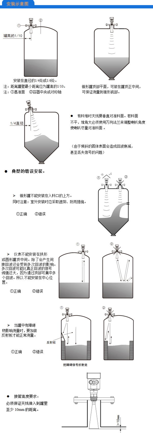 不锈钢(喇叭天线) PP/-40~80℃(棒式天线) PTFE/-40~230℃(棒式天线) |